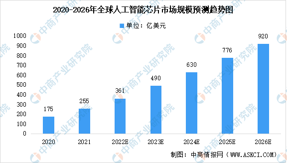 人工智能一直是行業內大力發展的核心技術之一,越來越多的公司將人工智能應用于其終端產品中以提升產品性能或拓展應用領域,這一趨勢帶動了人工智能芯片行業的快速增長。根據Frost&Sullivan數據顯示,2021年全球人工智能芯片市場規模為255億美元。預計2021-2026年,全球人工智能芯片市場規模將以29.3%的復合增長率增長,2023年將達到490億美元。